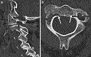 - ↑ Pratt, H.; Davies, E.; King, L. (2008). "Traumatic injuries of the c1/c2 complex: computed tomographic imaging appearances". Curr Probl Diagn Radiol. 37 (1): 26–38. doi:10.1067/j.cpradiol.2007.07.001. PMID 18054664.