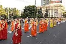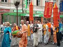 ISKCON devotees follow a disciplic line of Gaudiya Vaishnavas and are the largest branch of Gaudiya Vaishnavism.[3] Vaishnavism means 'worship of Vishnu', and Gauḍa refers to the area where this particular branch of Vaishnavism originated, in the Gauda region of West Bengal and Bangladesh. Gaudiya Vaishnavism has had a following in India, especially West Bengal and Odisha, for the past five hundred years. Gaudiya Vaishnavism was founded by Chaitanya Mahaprabhu, who rapidly spread his form of ecstatic bhakti (devotion) throughout Bengal. He established Sankirtan, the practice of publicly expressing devotion to Krishna, the Supreme God, through dance and song. This form of communal worship responded to rigid caste structures by engaging all people in worship regardless of caste and creed. Sri Chaitanya Mahaprabhu emphasized chanting the Hare Krishna Mahamantra (the 'great mantra'). He is considered by Gaudiya Vaishnavas to be an incarnation of Krishna himself.[8][9]