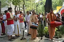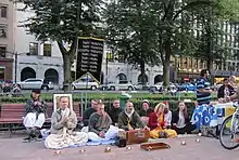 ISKCON advocates preaching.[25] Members try to spread Krishna consciousness primarily by singing the Hare Krishna mantra in public places and by selling Indian spiritual books transcribed from their original languages and published in English by the movement's founder, Prabhupada.[26]