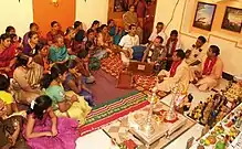 ISKCON devotees meet regularly (typically on Sunday at a program known as the Sunday Feast)[21] to worship deities, listen to discourses by senior devotees, participate in kirtan and eat sanctified offered food prasadam. Devotees place great emphasis on listening to spiritual discourses, believing them to be a key role in spiritual advancement.[22]