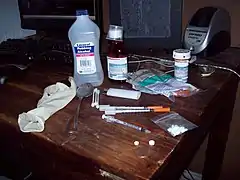 - ↑ Palmateer N, Kimber J, Hickman M, Hutchinson S, Rhodes T, Goldberg D (May 2010). "Evidence for the effectiveness of sterile injecting equipment provision in preventing hepatitis C and human immunodeficiency virus transmission among injecting drug users: a review of reviews". Addiction. 105 (5): 844–859. doi:10.1111/j.1360-0443.2009.02888.x. PMID 20219055.