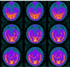 Brain SPECT transaxial images of a patient afflicted with Hashimoto's encephalopathy. | |