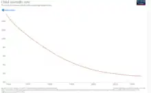 Demographic transition have been notorious in the last 7 decades in Mexico. Life expectancy at birth (general) changed from being 45 years in 1950 to 71.5 years in 1990, and to actually reach 77.5 years, close to some high-income countries in America and the World.[48][51] Child mortality rate, as one of the major health trends, have improved most notoriously after 1950, when an average of 252 children under-five years were dead per 1000 live births, decreasing to 44.5 in 1990 and reaching 14.6, in 2018.[48][51] Finally, after 1970, at least 20 years after the major changes in life expectancy and child mortality rate, there was a decrease in fertility rate. In 1950 it was estimated that for every woman, around 6.67 babies were born; in 1970, it increased to 6.8 and then, steadily decreased to 3.4 in 1990 to finally end in 2.1, which is below the world average.[48][51]