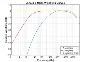 Researchers use different weights to account for noise frequency with intensity, as humans do not perceive sound at the same loudness level.[14] The most commonly used weighted levels are A-weighting, C-weighting, and Z-weighting. A-weighting mirrors the range of hearing, with frequencies of 20 Hz to 20,000 Hz.[14] This gives more weight to higher frequencies and less weight to lower frequencies.[14][19] C-weighting has been used to measure peak sound pressure or impulse noise, similar to loud short-lived noises from machinery in occupational settings.[19][20] Z-weighting, also known as zero-weighting, represents noise levels without any frequency weights.[19][20]