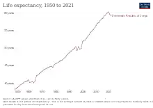 In 2018, the CIA estimated the average life expectancy in the DR Congo to be 60.3 years: 59 for the male population and 61.6 for females (est. 2017.)[6]