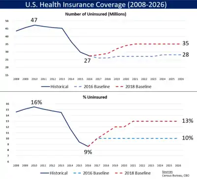 Several public and private sources report the number and percentage of the uninsured.[12] The Congressional Budget Office (CBO) reported the actual number of uninsured at 28.3 million in 2015, 27.5 million in 2016, 27.8 million in 2017, and 28.9 million in 2018.[19] The CBO May 2019 ten-year forecast reflected the policies of the Trump administration and estimated the number of uninsured would rise from 30 million in 2019, to 34 million by 2026, and to 35 million by 2029.[1] In a previous March 2016 ten-year forecast reflecting the policies of the Obama administration, CBO forecast 27 million uninsured in 2019 and 28 million in 2026.[20] The primary reason for the 6.5 million (24%) increase in uninsured from 2016 to 2029 is the repeal of the ACA individual mandate to have health insurance, enacted as part of the Trump tax cuts, with people not obtaining comprehensive insurance in the absence of a mandate or due to higher insurance costs.[9]