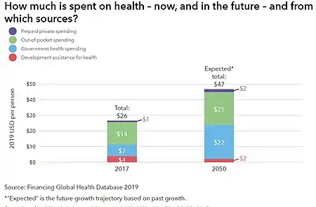 In 2018, health expenditure per capita for Niger was 30 US dollars. Though Niger health expenditure per capita fluctuated substantially in recent years, it tended to increase through 2004 – 2018 period ending at 30 US dollars in 2018.[12] The diagram shows the present and future expenditure on health and the sources from which it is spent from.[11]