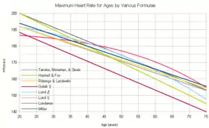 HRmax is strongly correlated to age, and most formulas are solely based on this.[35] Studies have been mixed on the effect of gender, with some finding that gender is statistically significant, although small when considering overall equation error, while others finding negligible effect.[41] The inclusion of physical activity status, maximal oxygen uptake, smoking, body mass index,[40] body weight, or resting heart rate[38] did not significantly improve accuracy. Nonlinear models are slightly more accurate predictors of average age-specific HRmax, particularly above 60 years of age, but are harder to apply, and provide statistically negligible improvement over linear models.[38][41] The Wingate formula is the most recent, had the largest data set, and performed best on a fresh data set when compared with other formulas, although it had only a small amount of data for ages 60 and older so those estimates should be viewed with caution.[41] In addition, most formulas are developed for adults and are not applicable to children and adolescents.[45]