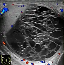 A hematocele is a collections of blood in a body cavity or potential space.[1] The term most commonly refers to the collection of blood in the tunica vaginalis around the testes, known as a scrotal hematocele.[2][3] Hematoceles can also occur in the abdominal cavity[4] and other body cavities.[5][6] Hematoceles are rare, making them harder to diagnose and treat.[7] They are very common especially as slowly growing masses in the scrotum usually in men older than 50 years.[8]