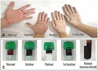 Cyanosis is the most common sign of hemoglobin M disease, which can be observed in all kinds of hemoglobin M diseases. It is mostly presented in the patient's lips and fingertips.[15] Cyanosis in hemoglobin M disease results from elevated levels of metHb and sulfhemoglobin (sulfHb).[16] Dark brown blood is another major sign of hemoglobin M disease. Hemoglobin M diseases caused by different HbM variants may have slight variations in their signs and symptoms, some include signs such as hemolytic anemia, decreased HbA1c, and abnormal co-oximetry.[13][17][18] Onset of cyanosis varies among alpha-, beta- and gamma-chain variants. Infants with alpha- or gamma-chain variants manifest cyanosis since birth but transient neonatal cyanosis caused by gamma-chain variants resolves soon after the disappearance of fetal Hb. Infants with beta-globin variants become cyanotic around 6 months after birth with the completion of the fetal-to-adult Hb switch.[19]