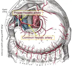 The hepatic artery proper (also proper hepatic artery) is the artery that supplies the liver and gallbladder. It raises from the common hepatic artery, a branch of the celiac artery.
