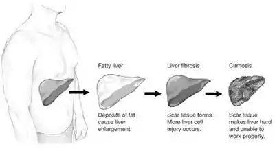 Fatty liver can develop into a fibrosis or a liver cancer.[6] For people affected by NAFLD, the 10-year survival rate was about 80%. The rate of progression of fibrosis in NASH is estimated to one per 7 years and 14 years for NAFLD, with an increasing speed.[7][8] There is a strong relationship between these pathologies and metabolic illnesses (diabetes type II, metabolic syndrome). These pathologies can also affect non-obese people, who are then at a higher risk.[6]