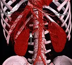 ![]() Volume rendering of an abdominal CT, with hepatic veins annotated by arrows. The aorta and branches is seen in center. | |