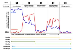 Individuals who remain HBsAg positive for at least six months are considered to be hepatitis B carriers.[60] Carriers of the virus may have chronic hepatitis B, which would be reflected by elevated serum alanine aminotransferase (ALT) levels and inflammation of the liver, if they are in the immune clearance phase of chronic infection. Carriers who have seroconverted to HBeAg negative status, in particular those who acquired the infection as adults, have very little viral multiplication and hence may be at little risk of long-term complications or of transmitting infection to others.[61] However, it is possible for individuals to enter an "immune escape" with HBeAg-negative hepatitis.