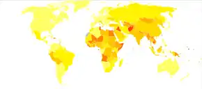The primary method of transmission reflects the prevalence of chronic HBV infection in a given area. In low prevalence areas such as the continental United States and Western Europe, injection drug abuse and unprotected sex are the primary methods, although other factors may also be important.[101] In moderate prevalence areas, which include Eastern Europe, Russia, and Japan, where 2–7% of the population is chronically infected, the disease is predominantly spread among children. In high-prevalence areas such as China and South East Asia, transmission during childbirth is most common, although in other areas of high endemicity such as Africa, transmission during childhood is a significant factor.[102] The prevalence of chronic HBV infection in areas of high endemicity is at least 8% with 10–15% prevalence in Africa/Far East.[103] As of 2010, China has 120 million infected people, followed by India and Indonesia with 40 million and 12 million, respectively. According to World Health Organization (WHO), an estimated 600,000 people die every year related to the infection.[104]