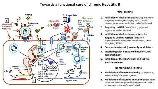 In terms of a cure for chronic Hepatitis B we find that what is currently available does not meet the definition of a 'functional cure', which is "defined as the loss of hepatitis B surface antigen and absence of viral replication for at least 6 months off-therapy". In light of this a recent review article indicates various possible targets to arrive at such a cure.[118][119]