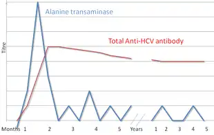 Chronic hepatitis C is defined as infection with the hepatitis C virus persisting for more than six months based on the presence of its RNA.[18] Chronic infections are typically asymptomatic during the first few decades,[18] and thus are most commonly discovered following the investigation of elevated liver enzyme levels or during a routine screening of high-risk individuals. Testing is not able to distinguish between acute and chronic infections.[24] Diagnosis in the infant is difficult as maternal antibodies may persist for up to 18 months.[48]