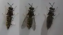 H. illucens is a mimic fly, very close in size, color, and appearance to the organ pipe mud dauber wasp and its relatives. The mimicry of this particular kind of wasp is especially enhanced in that the fly's antennae are elongated and wasp-like, the fly's hind tarsi are pale, as are the wasp's, and the fly has two small, transparent "windows" in the basal abdominal segments that make the fly appear to have a narrow "wasp waist".[15] Black soldier fly larvae can be differentiated from blowfly or housefly larvae by a thin gray-black stripe on their posterior ends.