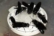 An adult female lays approximately 200 to 600 eggs at a time.[16] These eggs are typically deposited in crevices or on surfaces above or adjacent to decaying matter such as manure or compost, and hatch in about 4 days.[17] Freshly emerged larvae are 1.0 millimetre (0.04 in) long, being able to reach a length of 25 millimetres (1 in) and weight of 0.10 to 0.22 grams (1.5 to 3.4 gr) by the end of larval stage.[15] The larvae are able to feed on a wide variety of organic matter,[18][19][20][21] adapting to diets with different nutrient content.[22] The larval stage lasts from 18 to 36 days, depending on the food substrates provided to the larvae,[16][23] of which the postfeeding (prepupal) stage lasts around 7 days.[24] The length of larval stage can be delayed by months due to low temperature or lack of food.[17] The pupal stage lasts from 1 to 2 weeks.[24][25] Adults can live typically 47 to 73 days when provided with water and food, such as sugar in captivity or nectar in the wild,[26][27] or survive for about 8 to 10 days on fat reserves gathered during larval stage when water is provided.[16]