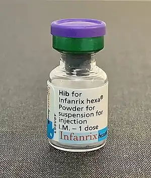 The Haemophilus influenzae type B vaccine, commonly known as Hib vaccine, is a vaccine used to provide protection against Haemophilus influenzae type b (Hib), a bacteria that can cause Haemophilus influenzae disease.[1] In countries that include it as a routine vaccine, rates of severe Hib infections have decreased more than 90%.[1] It has therefore resulted in a decrease in the rate of meningitis, pneumonia, and epiglottitis.[2] It is given by injection into a muscle.[2]