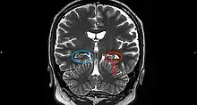 Hippocampal sclerosis (HS) or mesial temporal sclerosis (MTS) is a neuropathological condition with severe neuronal cell loss and gliosis in the hippocampus.[1] Neuroimaging tests such as magnetic resonance imaging (MRI) and positron emission tomography (PET) may identify individuals with hippocampal sclerosis.[2] Hippocampal sclerosis occurs in 3 distinct settings: mesial temporal lobe epilepsy, adult neurodegenerative disease and acute brain injury.[2][3]:1503