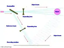 A main characteristic of a hologram is that every part of the stored information is distributed over the entire hologram.[3] Both processes of storage and retrieval are carried out in a way described by Fourier transformation equations.[24] As long as a part of the hologram is large enough to contain the interference pattern, that part can recreate the entirety of the stored image, but the image may have unwanted changes, called noise.[9]