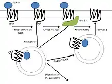 In contrast to receptor uncoupling, endocytosis can occur through multiple pathways. GPCR endocytosis has been shown to be either dependent or independent of arrestin activity, depending on the cell type used in the experiment; however, the former is more common. Furthermore, the same receptor expressed in two distinct cell types can be endocytosed through different mechanisms due to differences in GRK and arrestin expression: either through clathrin-coated vesicles or caveolae.[4] In general, receptor sequestration preferentially affects receptors that are both activated and phosphorylated, but the phosphorylation is not always a necessary component of endocytosis. After being sequestered, the affected receptors can either be degraded by lysosomes or reinserted into the plasma membrane, which is called receptor recycling.[5]