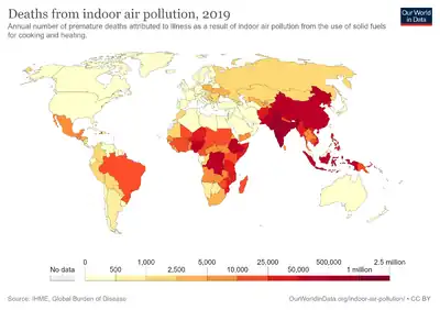 Household air pollution (HAP) is a significant form of indoor air pollution mostly relating to cooking and heating methods used in developing countries.[1] Since much of the cooking is carried out with biomass fuel, in the form of wood, charcoal, dung, and crop residue, in indoor environments that lack proper ventilation, millions of people, primarily women and children face serious health risks. In total, about three billion people in developing countries are affected by this problem. The World Health Organization (WHO) estimates that cooking-related pollution causes 3.8 million annual deaths.[2] The Global Burden of Disease study estimated the number of deaths in 2017 at 1.6 million.[3] The problem is closely related to Energy poverty and cooking.