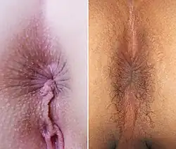 ![]() The anus of a female with a prominent perineal raphe (left) and a male with anal pubic hair (right) | |