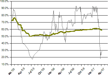 From inception through 2007, the total number of WHO-confirmed cases was 349, with 216 of those fatalities (as reported by the U.N. on January 15, 2008, confirming earlier deaths) reflecting a 62% fatality rate among WHO-confirmed cases through 2007.[25] These overall figures fail to bring forward fluctuations that have appeared from year to year and in particular geographic areas. In 2005, when a markedly less-lethal strain in Northern Vietnam was responsible for most of the cases reported worldwide, only 42 of 97 people confirmed by the WHO to be infected with H5N1 died — a 43% fatality rate. In 2006, the case fatality ratio was higher among the WHO-confirmed cases, with 79 deaths among 114 confirmed cases.[26]— or 69%. In 2007, 59 of the 86 WHO-confirmed cases ended in death, again a 69% fatality rate.[27] And 24 of the first 31 cases of 2008 (to April 30, 2008) have been fatal,[28] or 77%.
