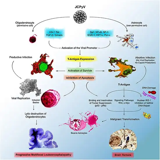- ↑ Del Valle, Luis; Piña-Oviedo, Sergio (2019). "Human Polyomavirus JCPyV and Its Role in Progressive Multifocal Leukoencephalopathy and Oncogenesis". Frontiers in Oncology. 9. doi:10.3389/fonc.2019.00711/full. ISSN 2234-943X.