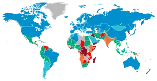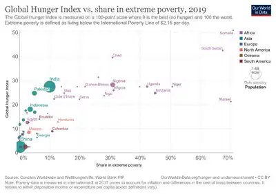 An alternative measure of hunger across the world is the Global Hunger Index (GHI). Unlike the FAO's measure, the GHI defines hunger in a way that goes beyond raw calorie intake, to include for example ingestion of micronutrients. GDI is a multidimensional statistical tool used to describe the state of countries’ hunger situation. The GHI measures progress and failures in the global fight against hunger.[15] The GHI is updated once a year. The data from the 2015 report showed that Hunger levels have dropped 27% since 2000. Fifty two countries remained at serious or alarming levels.[16] The 2019 GHI report expresses concern about the increase in hunger since 2015. In addition to the latest statistics on Hunger and Food Security, the GHI also features different special topics each year. The 2019 report includes an essay on hunger and climate change, with evidence suggesting that areas most vulnerable to climate change have suffered much of the recent increases in hunger.[17][18]