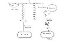 - Biosurfactants:[19] The contact between bacteria and hydrocarbons is fundamental because the first degradative step involves the use of oxygenase. Contact is favored by adhesion and emulsifying mechanisms[20] Bacteria that break down hydrocarbons often produce bioemulsifiers as secondary metabolites. These can be divided into low molecular weight molecules which effectively lower surface and interfacial tensions, and high molecular weight polymers which bond firmly to surfaces. Some bioemulsifiers promote the growth of bacteria on hydrophobic substrates insoluble in water by increasing their bioavailability, increasing their surface, desorbing them from surfaces and increasing their solubility. Biosurfactants have an amphiphilic nature, which allows the microorganisms that produce them to exploit hydrophobic substrates, allowing motility, avoiding competitors. The hydrophobic part usually comprises saturated or unsaturated fatty acids, fatty hydroxy acids or fatty alcohols with a chain length between 8 and 18 carbon atoms. The hydrophilic components consist either of small hydroxyl, phosphate or carboxylic groups, or of portions of carbohydrates or peptides. Biosurfactants are predominantly anionic and non-ionic compounds.