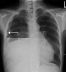 A hydropneumothorax with a white arrow pointing to the lung's pleura