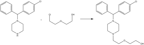 Hydroxyzine is synthesized by the alkylation of 1-(4-chlorobenzhydryl)piperazine with 2-(2-Chloroethoxy)ethanol:[47]