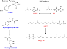Vitamin E biosynthesis occurs in the plastid and goes through two different pathways: the Shikimate pathway and the Methylerythritol Phosphate pathway (MEP pathway).[24] The Shikimate pathway generates the chromanol ring from the Homogentisic Acid (HGA) and the MEP pathway produces the hydrophobic tail which differs between tocopherol and tocotrienol. The synthesis of the specific tail is dependent on which molecule it originates from. In a tocopherol, its prenyl tail emerges from the geranylgeranyl diphosphate (GGDP) group, while the phytyl tail of a tocotrienol stems from a phytyl diphosphate.[24]