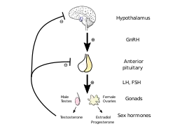 The activation and deactivation of the HPG axis also helps to regulate life cycles.[7] At birth FSH and LH levels are elevated, and females also have a lifetime supply of primary oocytes. These levels decrease and remain low through childhood. During puberty the HPG axis is activated by the secretions of estrogen from the ovaries or testosterone from the testes. This activation of estrogen and testosterone causes physiological and psychological changes. Once activated, the HPG axis continues to function in men for the rest of their life but becomes deregulated in women, leading to menopause. This deregulation is caused mainly by the lack of oocytes that normally produce estrogen to create the positive feedback loop. Over several years, the activity the HPG axis decreases and women are no longer fertile.[9]