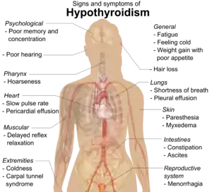 Hypothyroidism, also called underactive thyroid or low thyroid, is a disorder of the endocrine system in which the thyroid gland does not produce enough thyroid hormone.[3] It can cause a number of symptoms, such as poor ability to tolerate cold, a feeling of tiredness, constipation, slow heart rate, depression, and weight gain.[3] Occasionally there may be swelling of the front part of the neck due to goiter.[3] Untreated cases of hypothyroidism during pregnancy can lead to delays in growth and intellectual development in the baby or congenital iodine deficiency syndrome.[4]