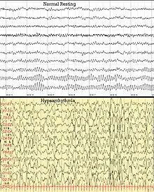 A comparison of an awake, resting (with activity), normal EEG with a hypsarrhythmia EEG. The hypsarrhythmia EEG is from a 4-month old girl with cryptogenic West syndrome. In it high amplitude waves and spikes are present, randomly appearing and with no topographical distribution identified; also, there is no frequency nor amplitude gradient, indicating a highly disorganized brain activity. Although having this seemingly chaotic EEG, the patient didn't show any clinical seizures while being recorded. | |