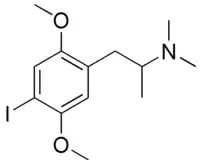IDNNA (2,5-dimethoxy-4-iodo-N,N-dimethylamphetamine) is a lesser-known psychedelic drug and a substituted amphetamine. It is also the N,N-dimethyl analog of DOI. IDNNA was first synthesized by Alexander Shulgin. In his book PiHKAL, the minimum dosage is listed as 2.6 mg, and the duration unknown.[1] IDNNA produces few to no effects. Very little data exists about the pharmacological properties, metabolism, and toxicity of IDNNA.