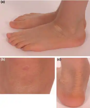 Over the first few weeks the redness disappears and is replaced by dry, flaking skin on the arms, legs and around the belly button.[6] Other areas of skin appear normal. The skin is fragile and is prone to blistering (caused by mild trauma or sweating).[6] After a few months hyperkeratosis develops with a dark grey or brown, ridged appearance on the ankles, knees and elbows.[5] Palms and soles are generally unaffected.[4] A slightly unpleasant, sweet odour may be present.[2]