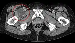 ![]() Enlarged iliopectineal bursa in CT - scan | |