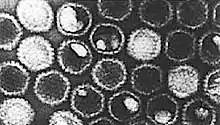 Transmission electron micrograph of Gallid alphaherpesvirus 1 virions | |