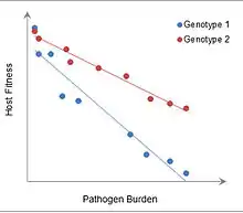 Schematic of the reaction norm of tolerance (after[45]). Organisms of genotype 2 are considered more tolerant to the pathogen than organisms of genotype 1.