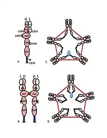 - ↑ Wiersma, E. J.; Shulman, M. J. (1995). "Assembly of IgM: role of disulfide bonding and noncovalent interactions". Journal of Immunology. 154 (10): 5265–5272. doi:10.4049/jimmunol.154.10.5265. PMID 7730630. S2CID 22148157.