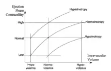 The preload and the Frank-Starling (mechanically)-induced level of contractility is modulated by variation of intravascular volume (volume expansion or volume reduction/diuresis).