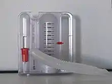 ![]() A typical incentive spirometer consists of an inhalation nozzle, which is seen facing toward the camera. The curved plastic on the left is a handle. The piston is in the middle (along with an adjustable mark to indicate a goal), and on the right side is a flow indicator showing whether the patient is inhaling too rapidly. | |