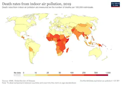 Indoor air pollution is a major health hazard in developing countries.[2] A major source of indoor air pollution is the burning of coal, and biomass including wood, charcoal, dung, or crop residue for heating and cooking.[3][4] This results in high concentrations of particulate matter and was responsible for roughly 1.5 million to 2 million deaths in 2000.[5]