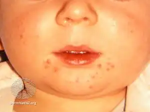 Infantile acne is a form of acne that begins in very young children.[1] It includes acne that persists beyond the newborn period and that has an onset between age 6-12 weeks and one-year.[1][2] Typical symptoms include facial papules, pustules, comedo and nodules.[1][3]