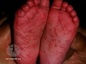 Infantile acropustulosis is an intensely itchy blistering eruption of the hands and feet of babies.[2] It typically appears in crops as small red bumps, which over 24-hours become small clear blisters and then small yellow blisters.[3] They last around 7 to 14 days with new crops appearing every 2 to 4 weeks.[3] Scratching them results in sores and crusting.[3]